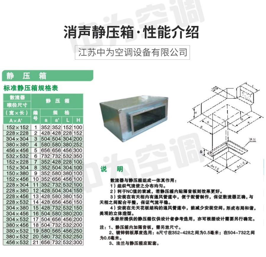 中為空調(diào)—靜壓箱是送風(fēng)系統(tǒng)減少動壓、增加靜壓、穩(wěn)定氣流和減少氣流振動的一種必要的配件,它可使送風(fēng)效果更加理想。靜壓箱是一種既能允許氣流通過,又能有效地阻止或減弱聲能向外傳播的裝置。