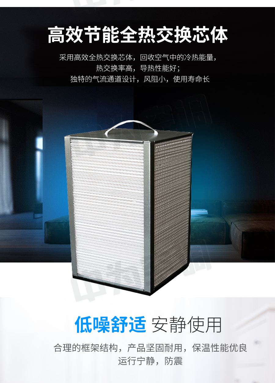 中為全熱交換器是提供新鮮空氣的一種空氣調(diào)節(jié)設(shè)備。功能上按使用環(huán)境的要求可以達(dá)到恒溫恒濕或者單純提供新鮮空氣。工作原理是在室外抽取新鮮的空氣經(jīng)過除塵、除濕(或加濕)、降溫(或升溫)等處理后通過風(fēng)機送到室內(nèi),在進(jìn)入室內(nèi)空間時替換室內(nèi)原有的空氣。