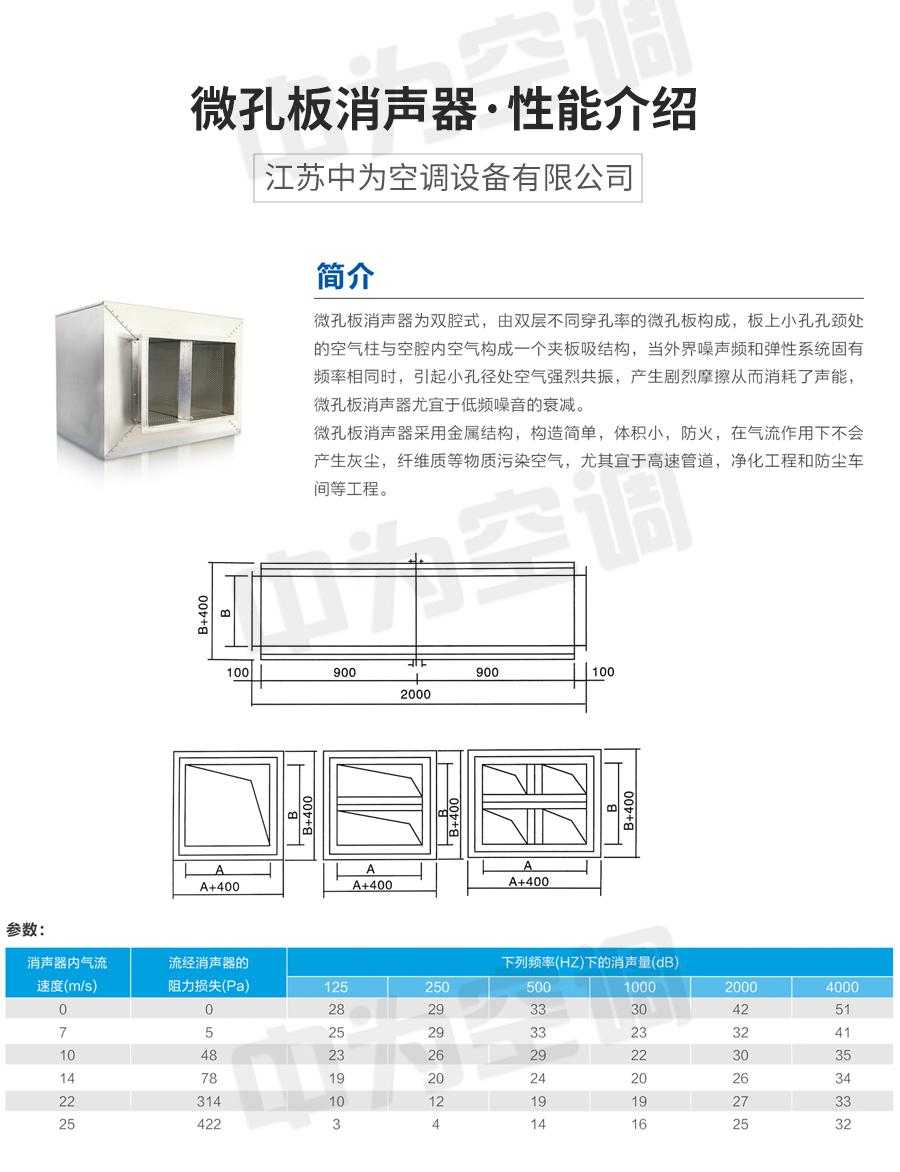 中為消聲器內(nèi)管道截面突變,內(nèi)外室之膨脹室作用,對低頻及部分中頻起有效的消聲作用,而阻式吸聲片對中高頻有良好的消聲作用,是一種廣頻消聲器,廣泛應(yīng)用于空調(diào)系統(tǒng)中降低中低壓風(fēng)機(jī)的噪聲,為加強(qiáng)消聲效果,也可多節(jié)消聲串聯(lián)使用,風(fēng)速一般在6-8米/秒。